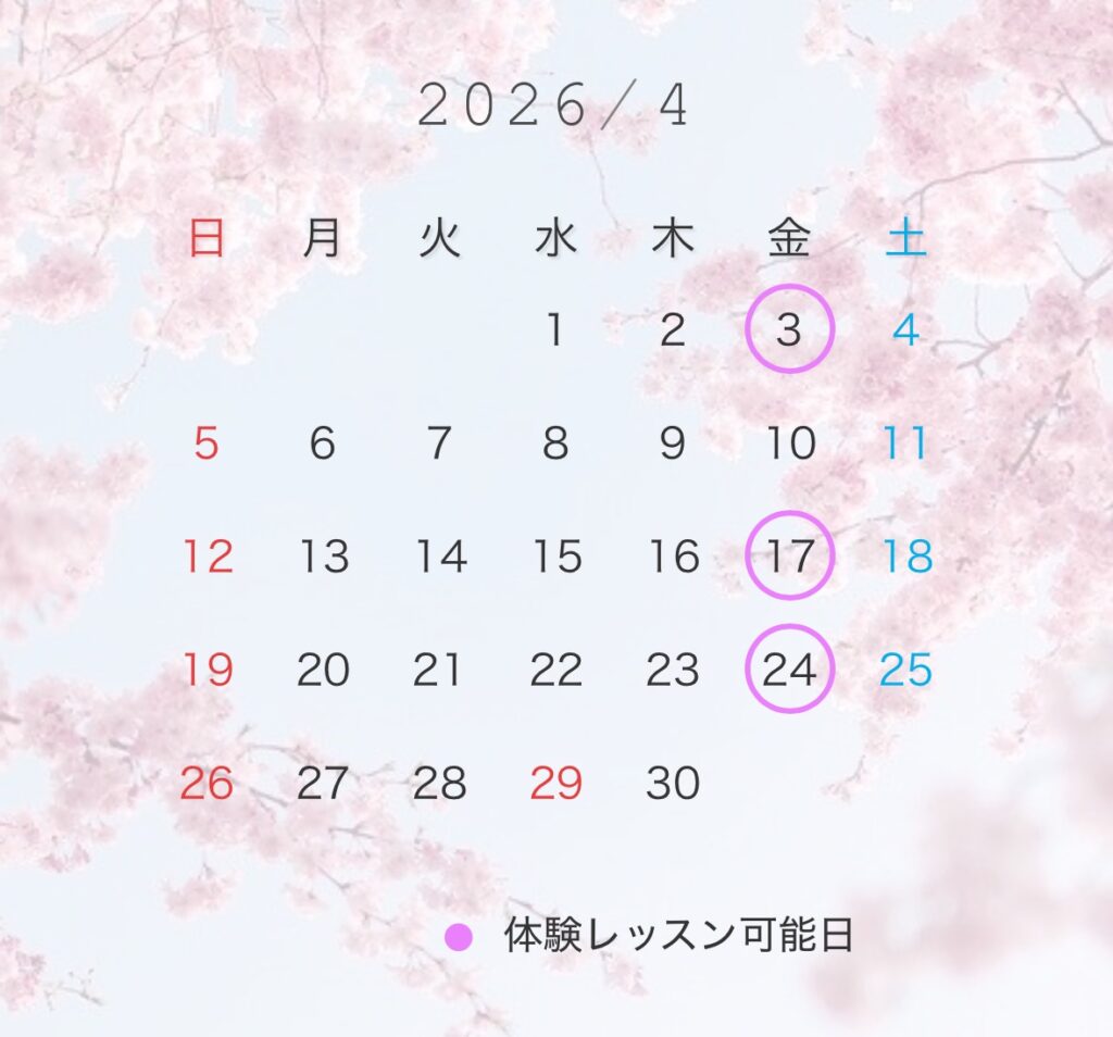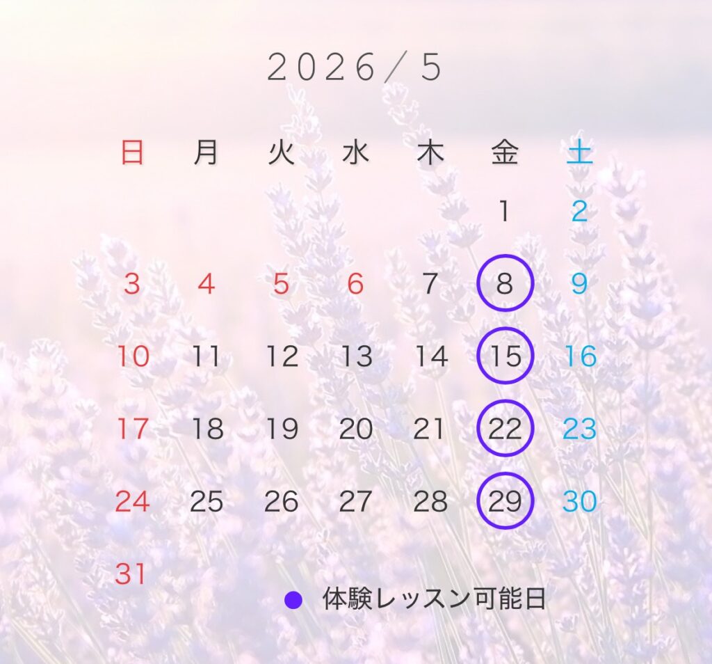 体験レッスンも上記の空き枠と同じ曜日・時間で行います。◯の日が体験レッスン可能日です。